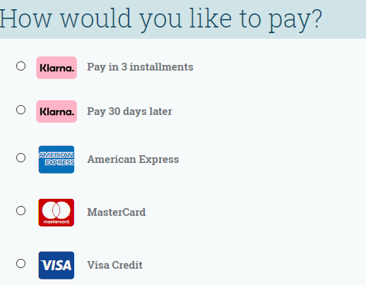 Once your order's confirmed, you'll receive an email with payment instructions within two days from Klarna. You'll then have 30 days to pay. Complete the payment online, at your convenience, with no extra cost. You can pay via credit or debit card at www.klarna.com/uk